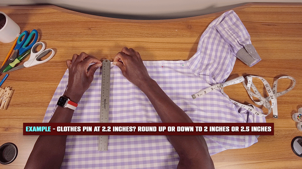 Your clothes pins are gonna look kinda weird with your dress shirt just all bunched inside of them. Don’t freak out and think “what is this idiot guy having me do?!” These are just here to give us a rough estimate on how much we want to take off of our shirt. They aren’t permanent spots by any means.