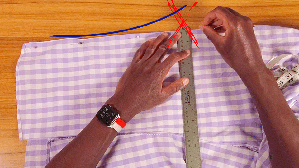 Iron the outside of your shirt so everything is nice and flat. Also check for any dimples at the top of your darts too. You might think it’s a bad idea to put darts in a shirt that has a pattern but it isn’t. Yes the pattern warps a bit, but having it fit your back much better is WAY better than having everything straight but super baggy.