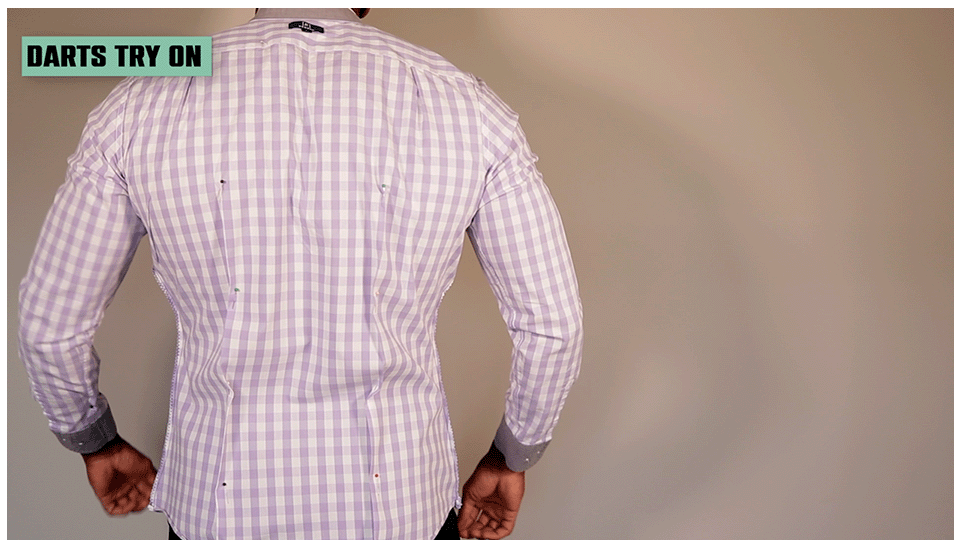 Try it on with the darts on it (inside out again like last time) and see how it feels. This part really catches guys off guard because they think that because their shirt is touching their lower back that it’s too tight. That’s not the case, it’s just the first time that a dress shirt has fit you properly, most likely ever. That being said, if it DOES feel too tight or restricting then adjust the pins around to different measurements to see what you like.