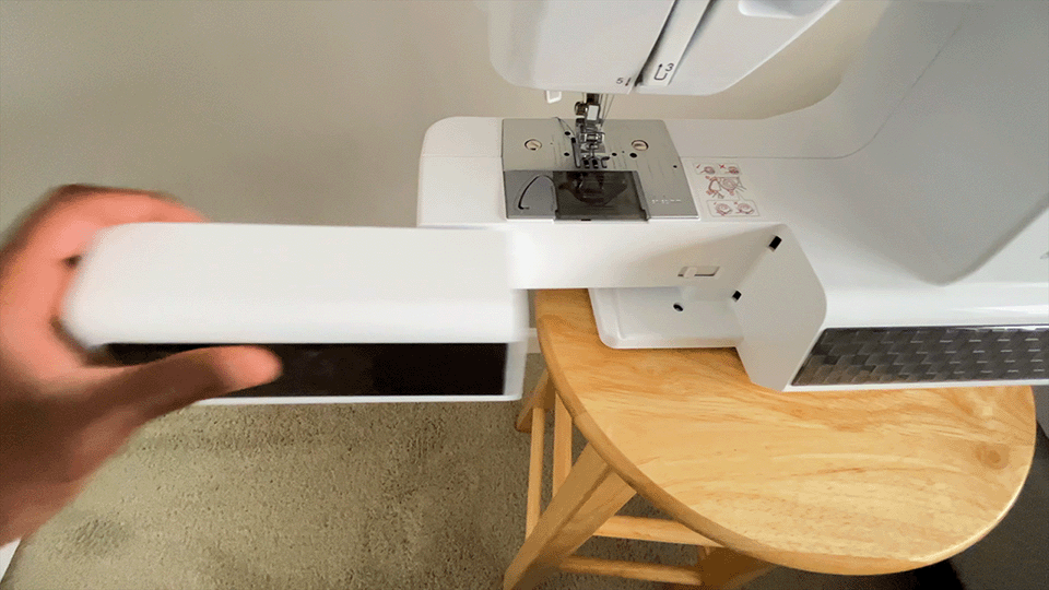 Now, take a look at your sewing machine. A nice close look. Does it have that little piece on the front of it, like an extension table or something similar? If so, take it off. We need to make sure our jeans can slide on easily, and that piece will be in the way.