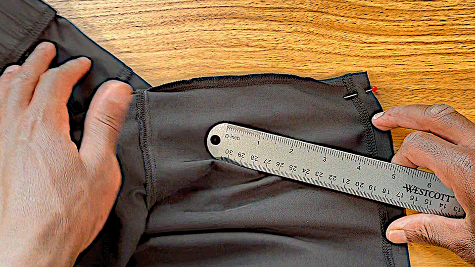 Now that we know how we want them to fit roughly, turn those mofos inside out and get ready to make some more precise measurements since our pinch and pin method isn’t repeatable on other shorts of a similar size. Find where you placed your safety pin or clothes pin—that’s your reference point. For me, I measured about 3/4 of an inch or 19 mm off at this spot, but I rounded up to a full inch or 25 mm for a cleaner measurement. Remember, since you’ll be sewing in from both sides of the seam, you’ll actually be doubling this amount (which will be 2 inches total or 50 mm). I like to just stick with remembering the number on one side when I’m measuring anything since it’s easier than doubling it every single time. But either one works, so if you want to double it or stick with the first number you want to make sure you’re consistent across your tailoring projects.